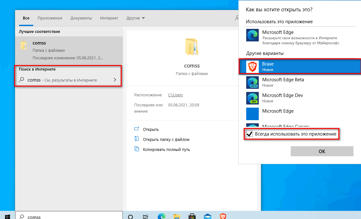 Новая функция не автоматизирована, но её настройка выполняется быстро. Все, что вам нужно сделать после обновления до версии Brave 1.30 - открыть внутреннюю страницу brave://settings/help для проверки версии. Простой способ – откройте результат веб-поиска в меню «Пуск». При отображении окна «выберите свой браузер», нажмите на Brave. Установите флажок «всегда использовать это приложение».