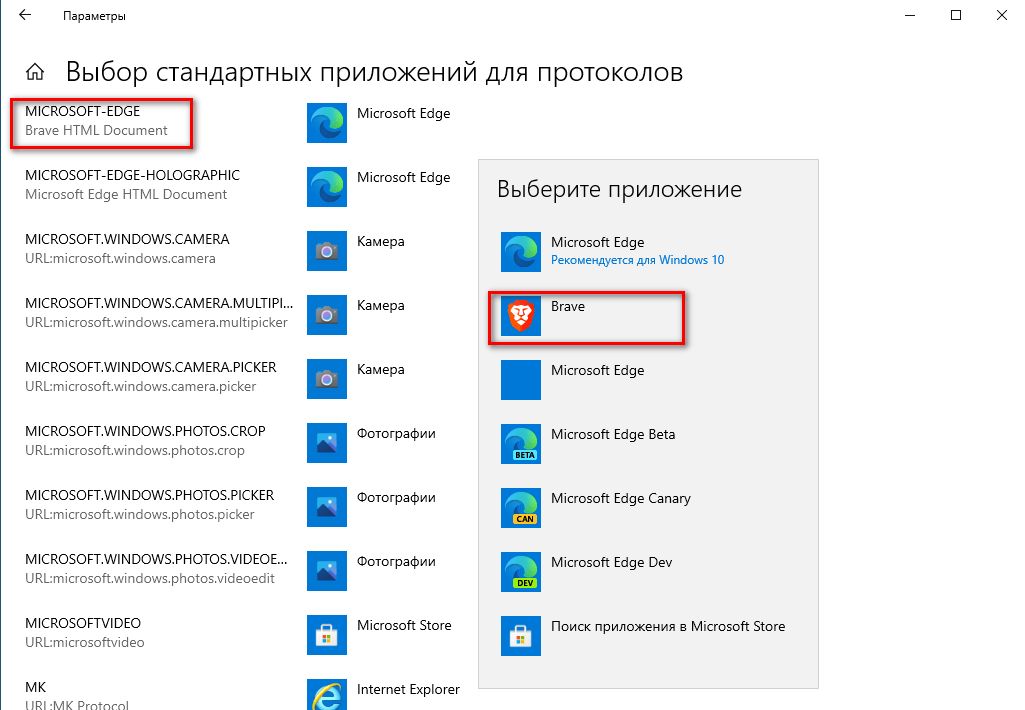 - Нажмите левой кнопкой мыши по Microsoft Edge во втором столбце и выберите Brave из списка «выберите приложение», чтобы назначить его протоколом по умолчанию.