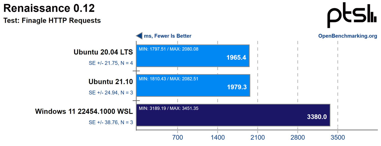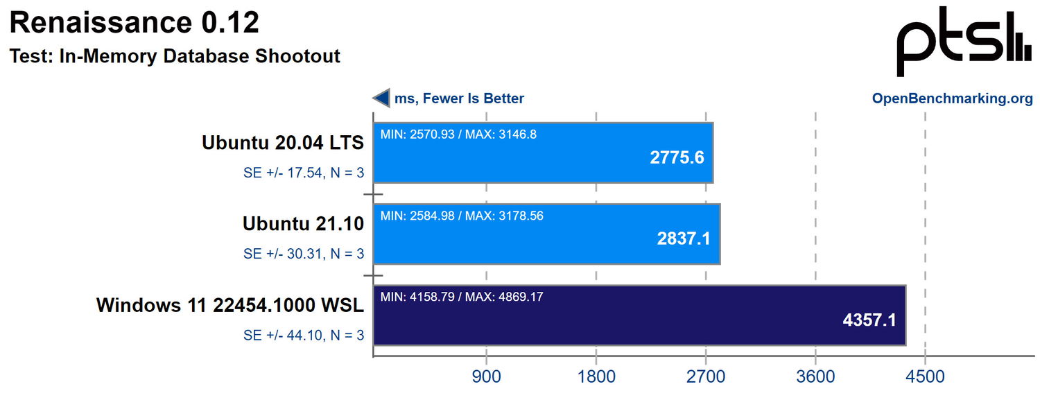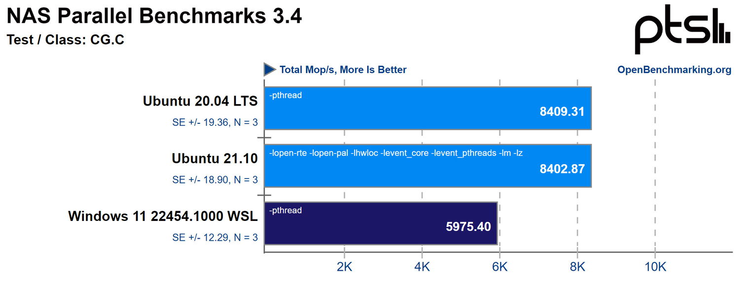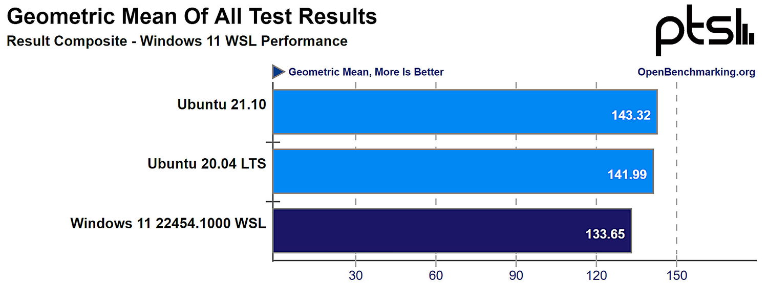 В целом, из 130 проведенных тестов производительность WSL 2 на Windows 11 примерно на 6-7% уступает Ubuntu 21.10, и немного меньше по сравнению с Ubuntu 20.04 LTS. Имейте в виду, что протестированная здесь сборка Windows 11 находится на инсайдерском канале, и производительность может отличаться от общедоступной версии Windows, которая выйдет в следующем месяце.