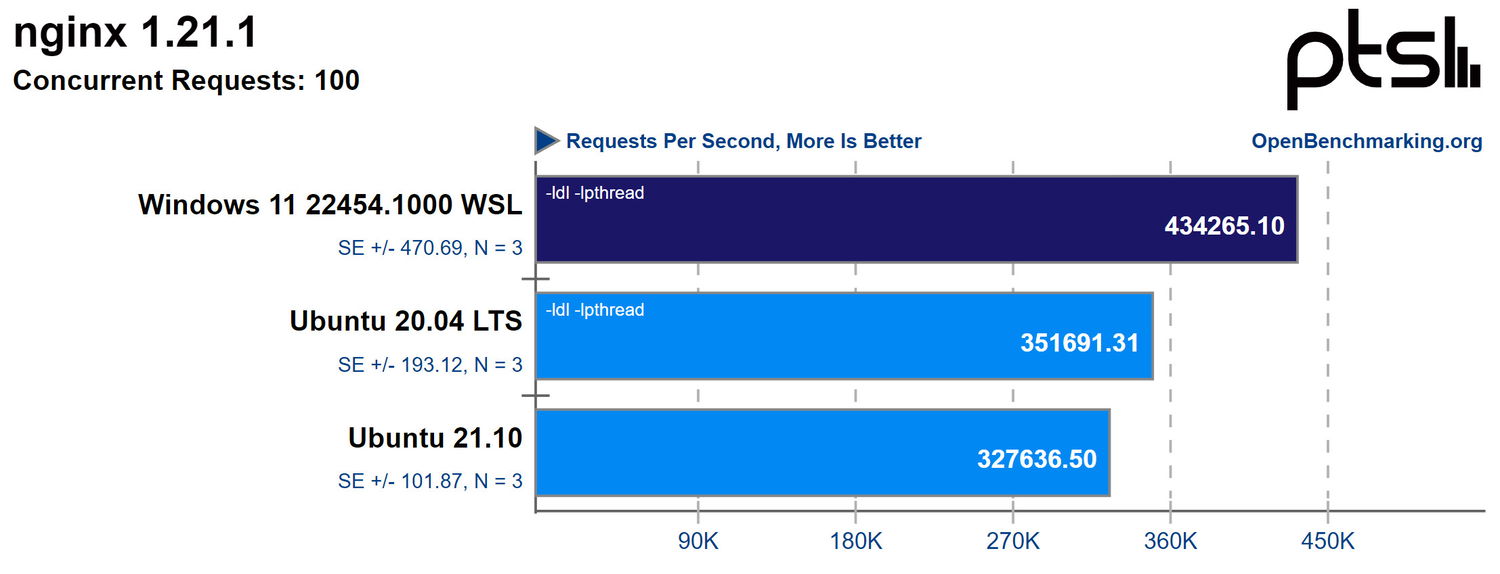 Однако, в некоторых тестах WSL2 с достаточно большим отрывом показывает лучший результат чем Ubuntu 21.10 и 20.04 LTS, например при тестировании веб-сервера Nginx.