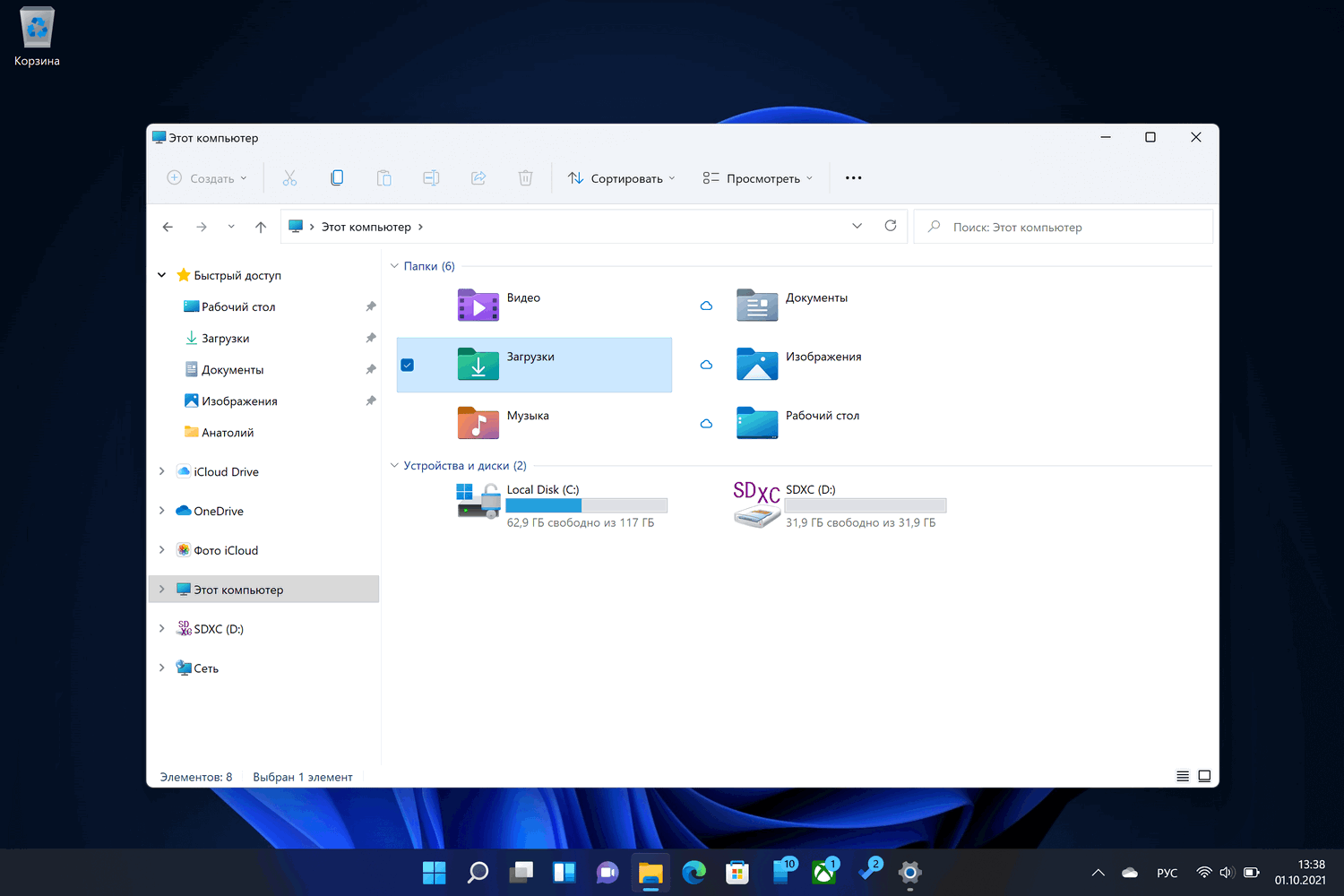 Теперь перейдем к новой системе. Первое изменение, которые заметят пользователи Windows 11 — это новые значки для стандартных папок Windows, таких как Рабочий стол, Документы, Загрузки, Музыка, Изображения и Видео. Обновлены были и другие системные значки, например значки устройств и дисков. Новый Проводник также получил закругленные углы, которые являются отличительной особенностью дизайна Windows 11. Многим нравится обновленный дизайн, потому что он кажется более свежим.
