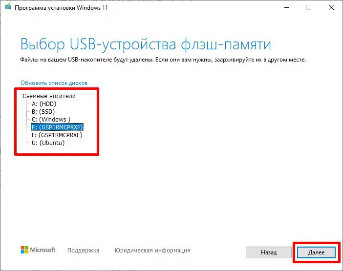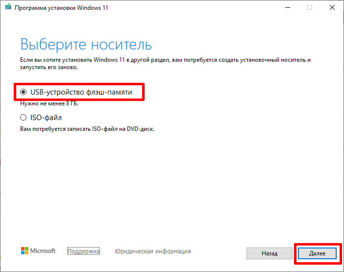 4. Для создания загрузочной USB-флэшки, выберите пункт USB-устройство флэш-памяти и нажмите кнопку Далее.
