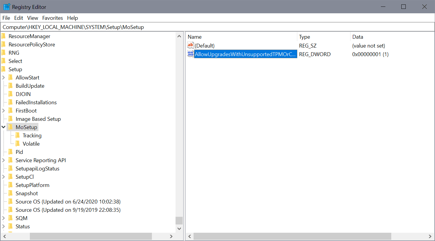 - Назовите параметр AllowUpgradesWithUnsupportedTPMOrCPU