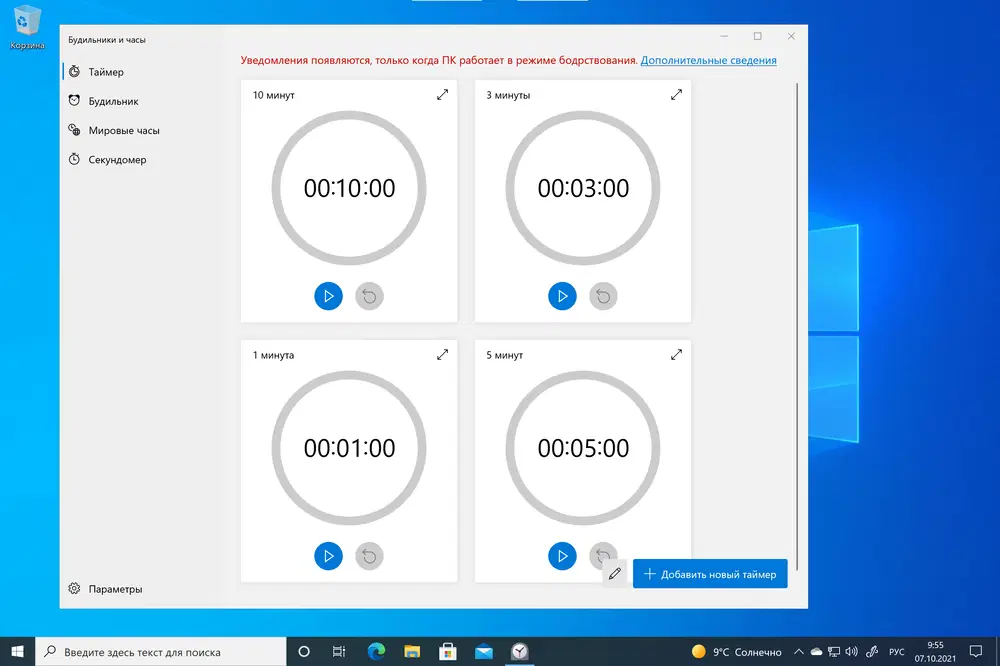 Как обычно, прежде чем перейти к обзору нового приложения «Часы» в Windows 11 освежим в памяти, то, что имеем в Windows 10. В Windows 10 доступно автономное приложение «Будильники и Часы», которое предлагает некоторые базовые функции, такие как таймеры, будильники, мировое время и секундомер. Пользователи могут настроить различные таймеры и будильники, они получат уведомления, если компьютер не находится в спящем режиме.