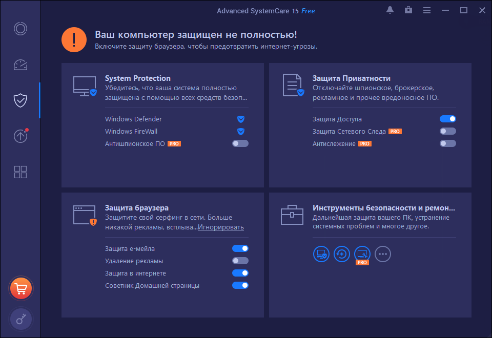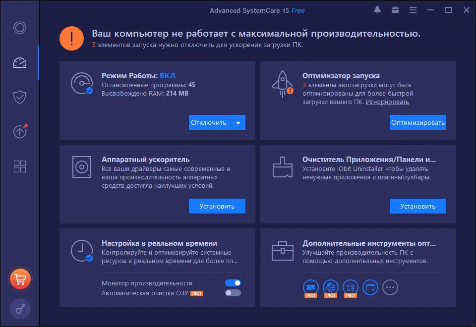 Если вам нужен расширенный контроль над процессами очистки и оптимизации, то ваш выбор — IObit Advanced SystemCare 15 PRO. Эта версия ПО включает в себя еще больше опций и инструментов.