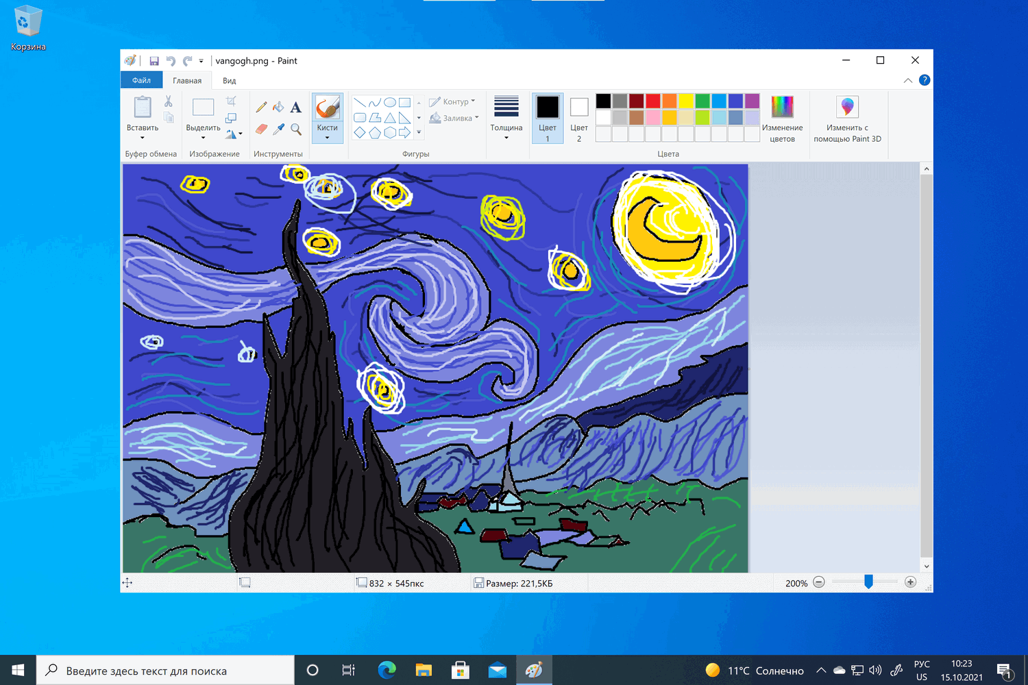 Ниже находятся три отдельные вкладки Файл, Главная и Вид. Вкладка Файл позволяет вам взаимодействовать с файлами, например, создавать новые, сохранять, печатать, устанавливать в качестве фона рабочего стола и т. д. Вкладка Главная отображается по умолчанию и содержит инструменты, которые вы можете использовать для рисования. На вкладке также есть опция Изменить с помощью Paint 3D. Наконец, на вкладке Вид вы можете отображать или скрывать определенные элементы пользовательского интерфейса, например линии сетки и строку состояния, увеличивать и уменьшать масштаб, переходить в полноэкранный режим и др. На нижней панели Paint отображается текущий размер холста в пикселях, а также уровень масштабирования.