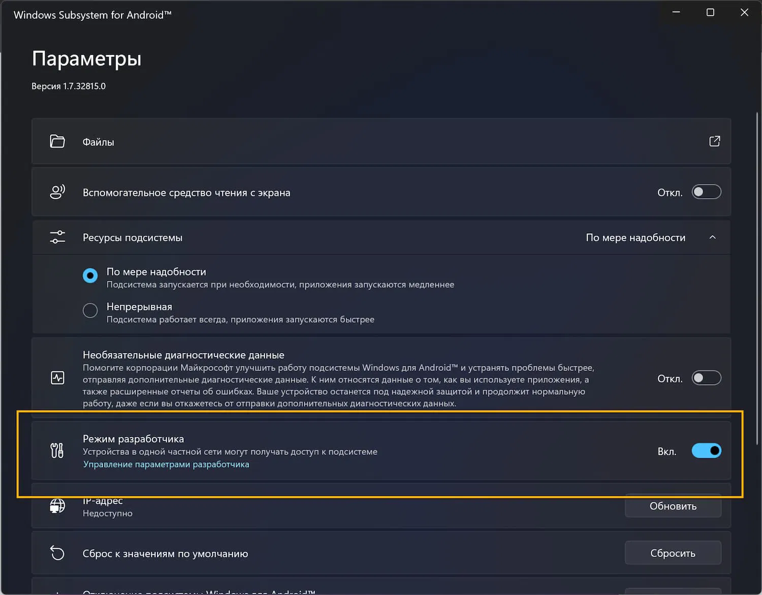 - Откроются настройки подсистемы. Вам нужно активировать переключатель Режим разработчика.