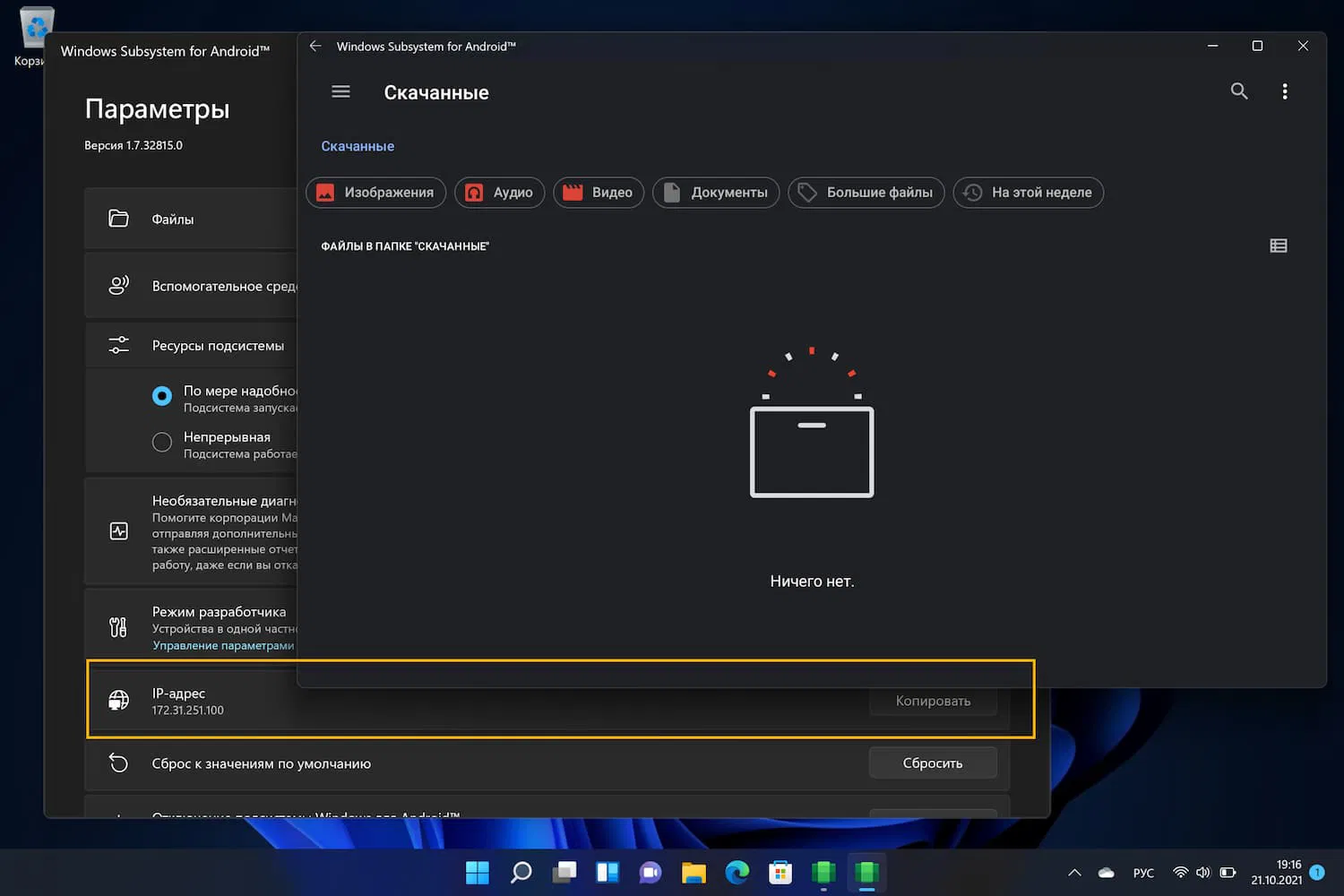 - Поскольку среда Android работает рядом с ядром хост-системы Windows, мы можем получить доступ к ней через интерфейс localhost (127.0.0.1). Фактически, слой Android также связывается со случайным IP из частной сети 172.30.0.0/24, которая видна под IP-адресом.