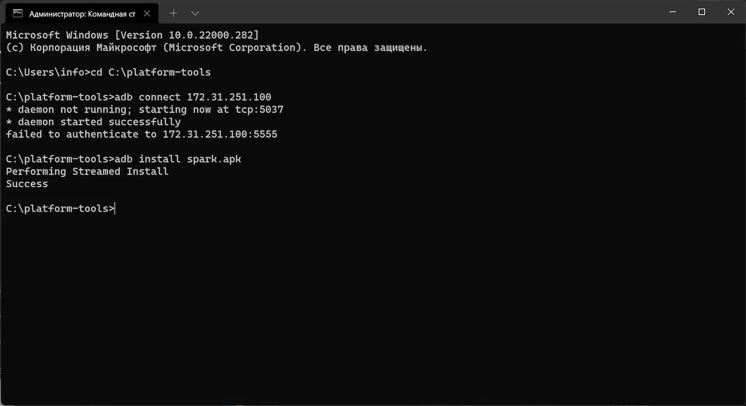 - Теперь можно установить наш APK через ADB. Команда должна быть следующей: