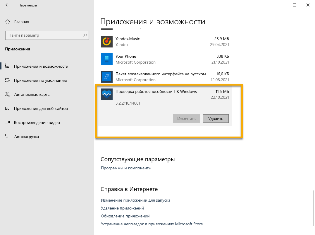 Удалить приложение PC Health Check можно, перейдя в Параметры > Приложения > Приложения и возможности > Проверка работоспособности ПК Windows (в списке приложений) > Удалить.