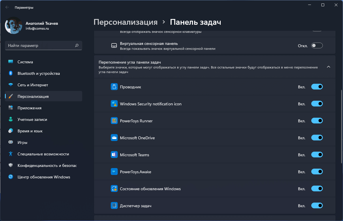 - Вы увидите все значки, отображаемые в области уведомлений панели задач. Нужно установить значение Вкл для всех значков.