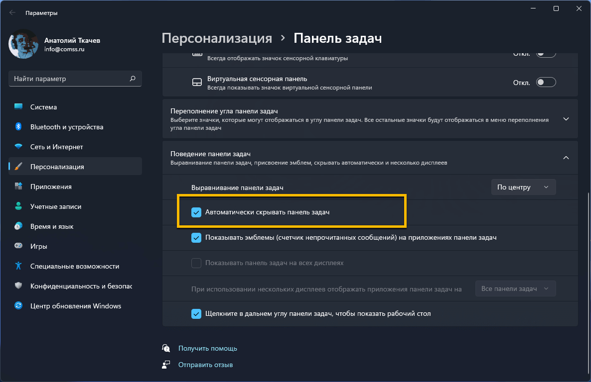 - В этой группе скрывается настройка Автоматически скрывать панель задач. При ее активации панель задач будет скрываться, когда курсор мыши будет выходить за пределы области панели задач.