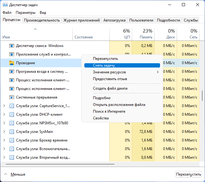 - Кликните правой кнопкой мыши по процессу и выберите опцию Снять задачу.