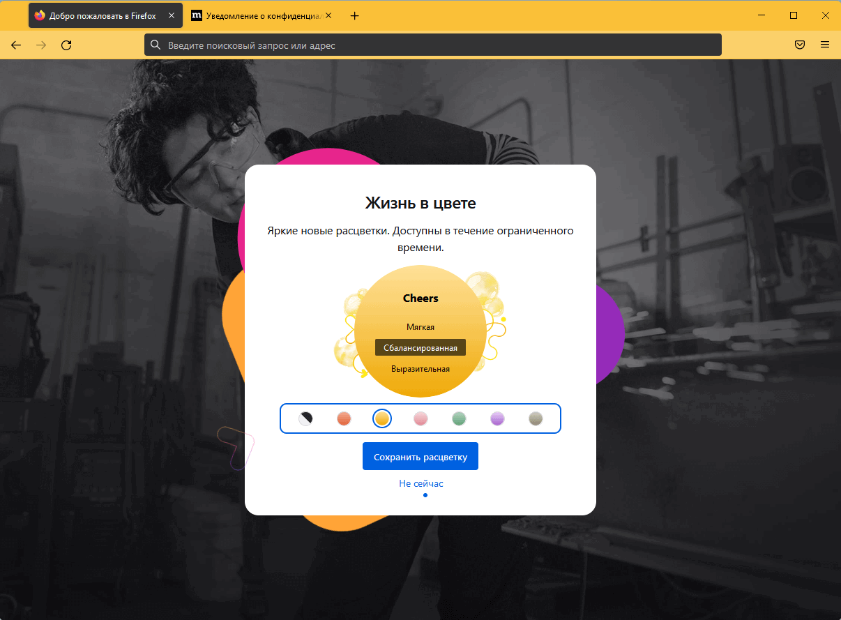 - При первом запуске Firefox показывает запрос «Расцветки», позволяющий выбрать цветовую расцветку.