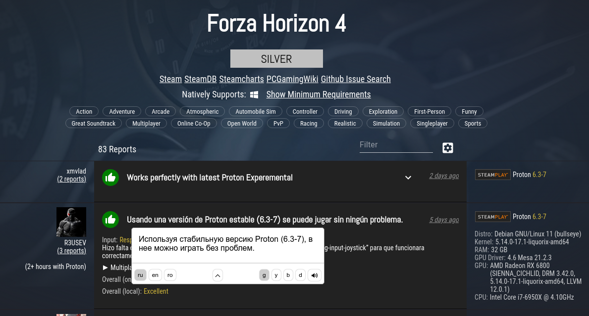 Изначально рейтинг предыдущей версии игры Forza Horizon 4, работающией под Linux, был крайне печальным. Судя по отчетам на ProtonDB, играть было невозможно.