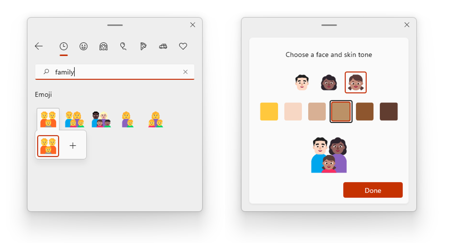 - Добавлена возможность персонализированных комбинаций смайлов на основе оттенков лица и кожи членов семьи, пар с сердцем, поцелуев и людей, держащихся за руки. Просто откройте панель смайликов (WIN + .) и попробуйте эти комбинации, введя в поле поиска "cемья", "пара", "держаться за руки" или "целоваться". Это нововведение доступно не всем участникам программы предварительной оценки Windows.
