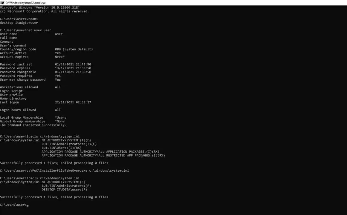 Данный эксплойт оказался работоспособным с тестовой системе под управлением Windows 10, версия 21H2. При локальном исполнении в контексте стандартной учетной записи, эксплойт позволил успешно получить повышенные привилегии. Портал Bleeping Computer также подтверждает информацию о работоспособности эксплойта.