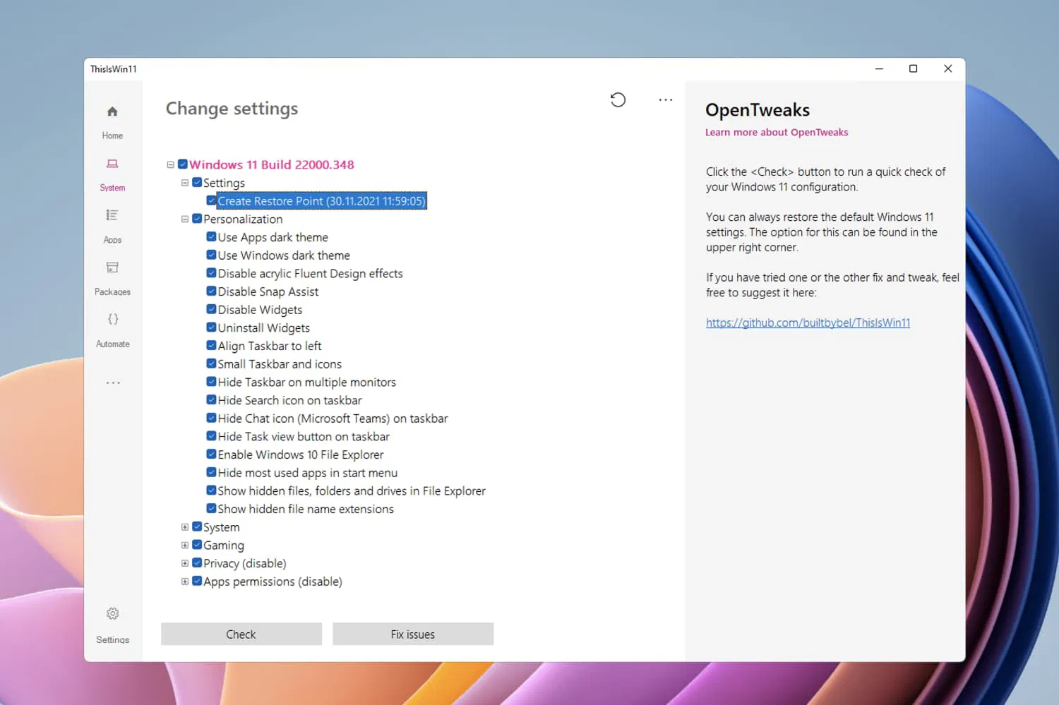 Как и Windows 10, Windows 11 также позволяет пользователям вручную удалять предустановленные приложения с помощью панели управления или приложения «Параметры». Но если вы хотите быстро удалить все нежелательное ПО из своей системы, то можете попробовать новое приложение с открытым исходным кодом под названием ThisIsWin11. Данная утилита позволяет настраивать расширенные и базовые функции операционной системы и отключать такие функции Windows 11, как интеграция Microsoft Teams на панели задач.