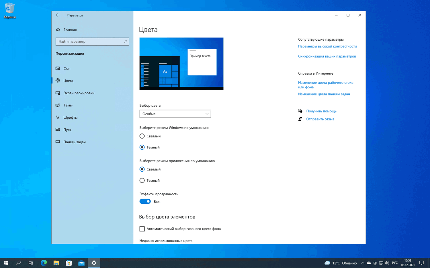 Итак, мы не будем обсуждать все индивидуальные настройки приложения «Параметры». Вместо этого сосредоточимся на общем пользовательском интерфейсе. Для примера приведем скриншот страницы Персонализация > Цвета.