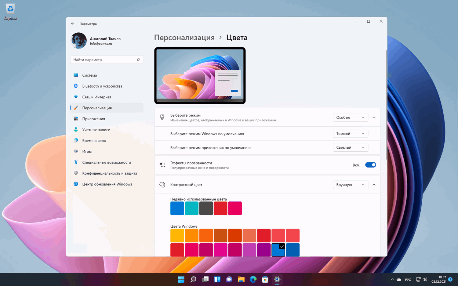 Для сравнения рассмотрим все ту же страницы Персонализация > Цвета в Windows 11.