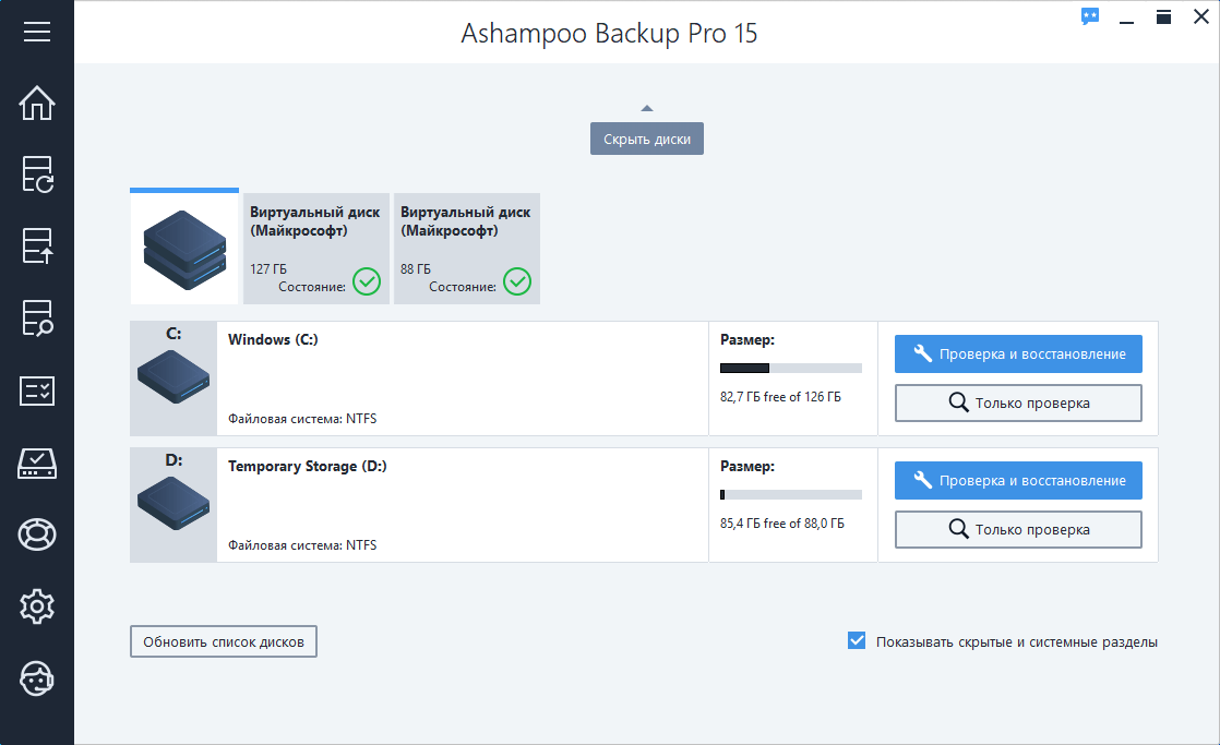 Во время резервного копирования Ashampoo Backup Pro 15 постоянно проверяет каждую операцию, чтобы избежать несоответствия данных. Это включает даже мониторинг состояния дисковых накопителей с мгновенным уведомлением, если диск находится на грани отказа.