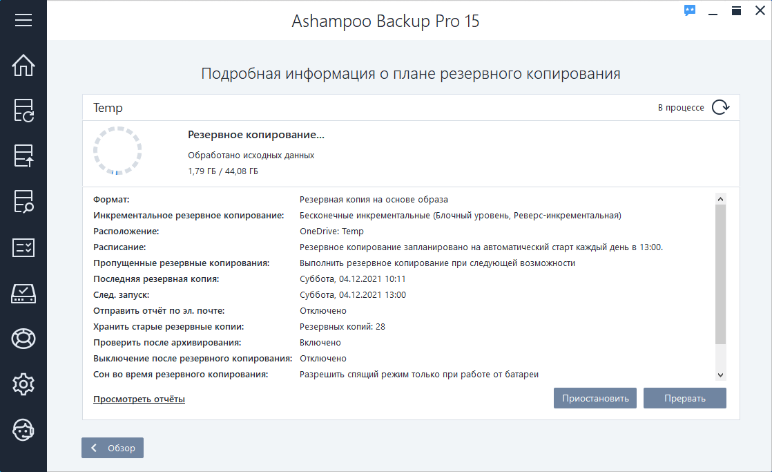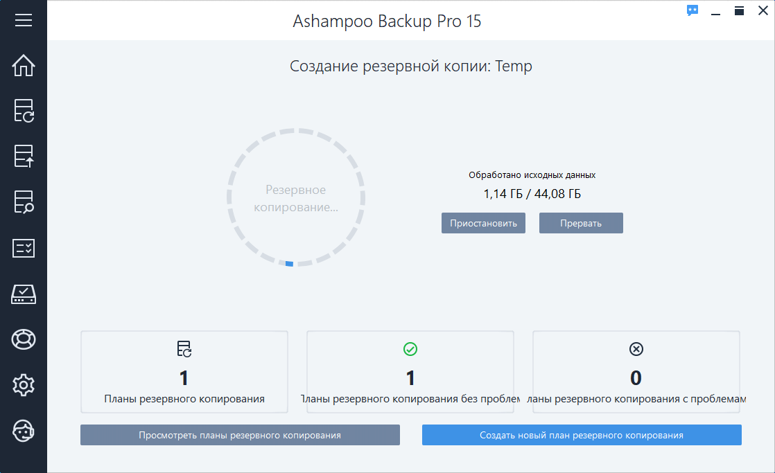 Версия 15 поставляется с обновленным стартовым меню, в котором вся необходимая информация представлена с первого взгляда. В отдельном меню теперь аккуратно перечислены все планы резервного копирования с ярлыками для всех важных сведений. Интеграция облачных сервисов была пересмотрена и оптимизирована для повышения производительности и безопасности. Благодаря многочисленным изменениям и улучшениям Ashampoo Backup Pro 15 – стабильное, универсальное и производительное решение для резервного копирования.
