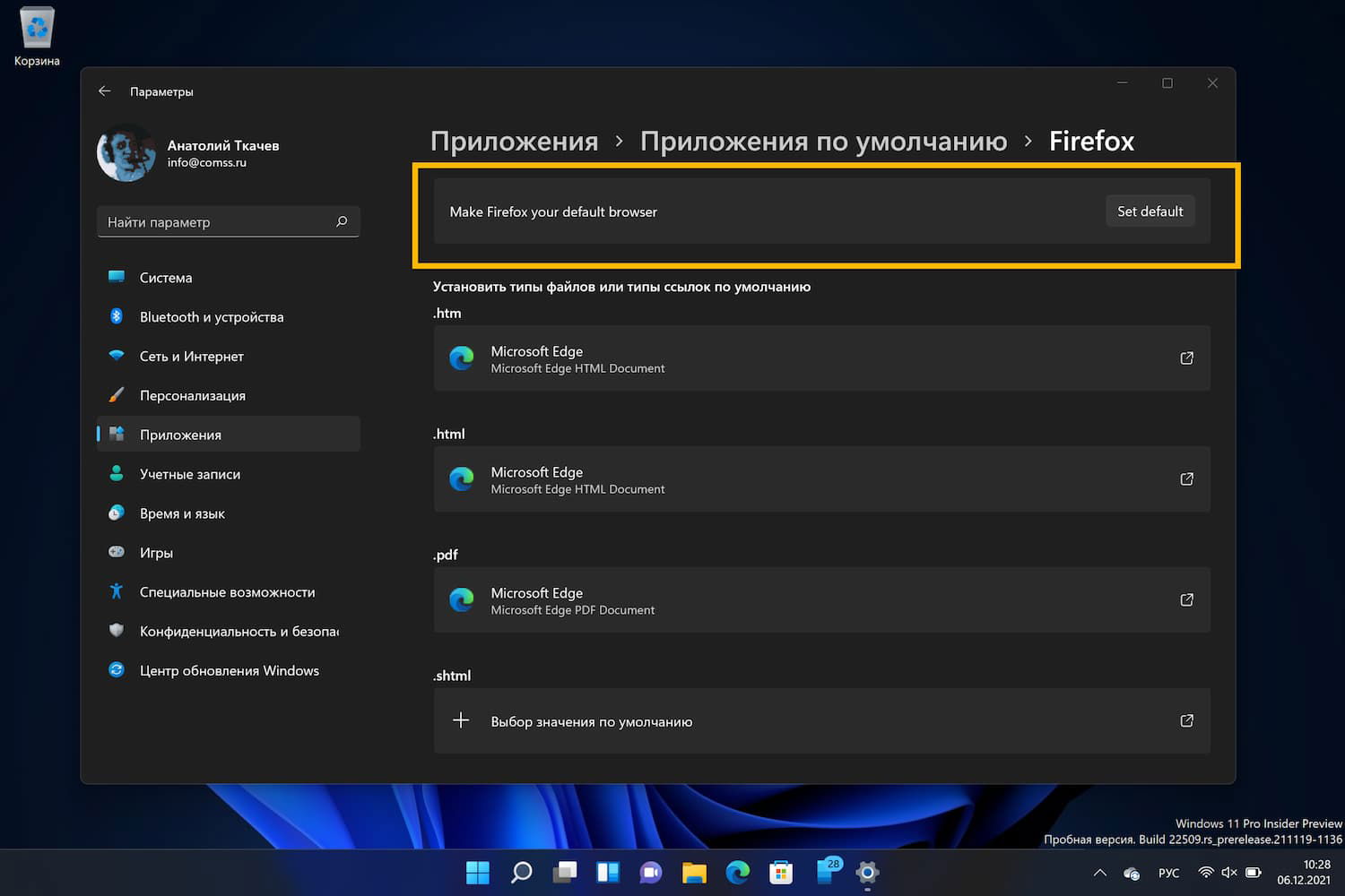 Просто выберите желаемый браузер в списке или с помощью окна поиска и нажмите кнопку Установить по умолчанию (Set default). После этого система автоматически назначит необходимые файловые ассоциации.