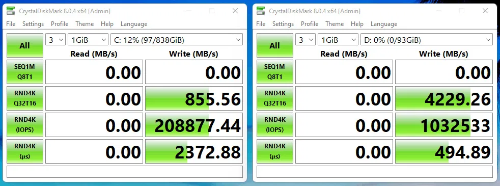 Samsung 980 Pro является SSD накопителем 4-го поколения, но даже более старые накопители третьей генерации также подвержены данной проблеме. Разница особо заметна на дисках с высокой теоретической скоростью — диск, не содержащий систему Windows показывает скорость в 5 раз быстрее.
