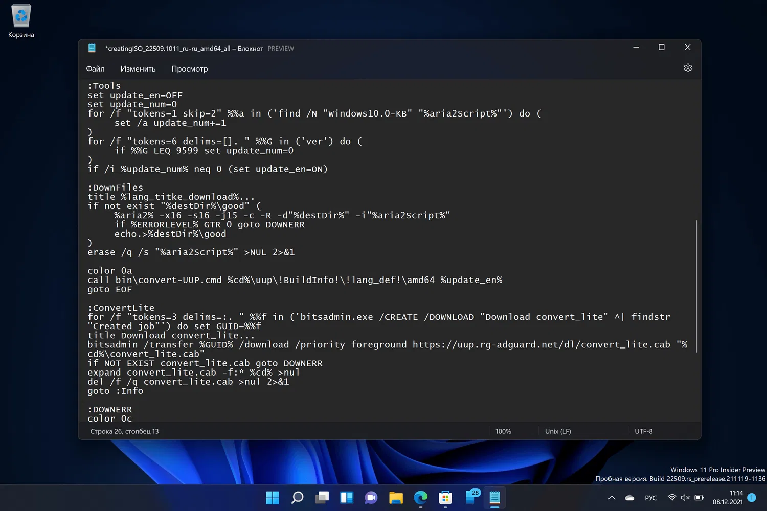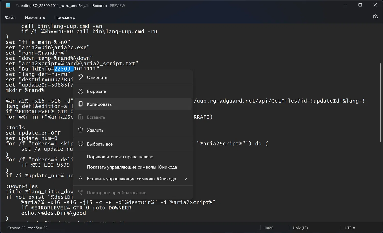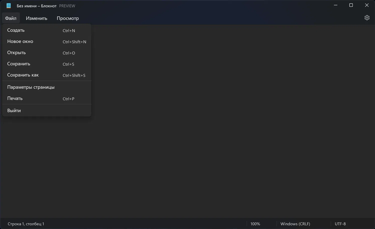 Интерфейс программы «Блокнот» в Windows 11, версия Dev и на Бета-канале претерпел некоторые визуальные изменения. Строка заголовка, строка меню и строка состояния теперь более отчетливо отделены от основной области редактора с помощью цветовых решений. В строке заголовка пока есть обозначение «PREVIEW» (Предварительная версия).