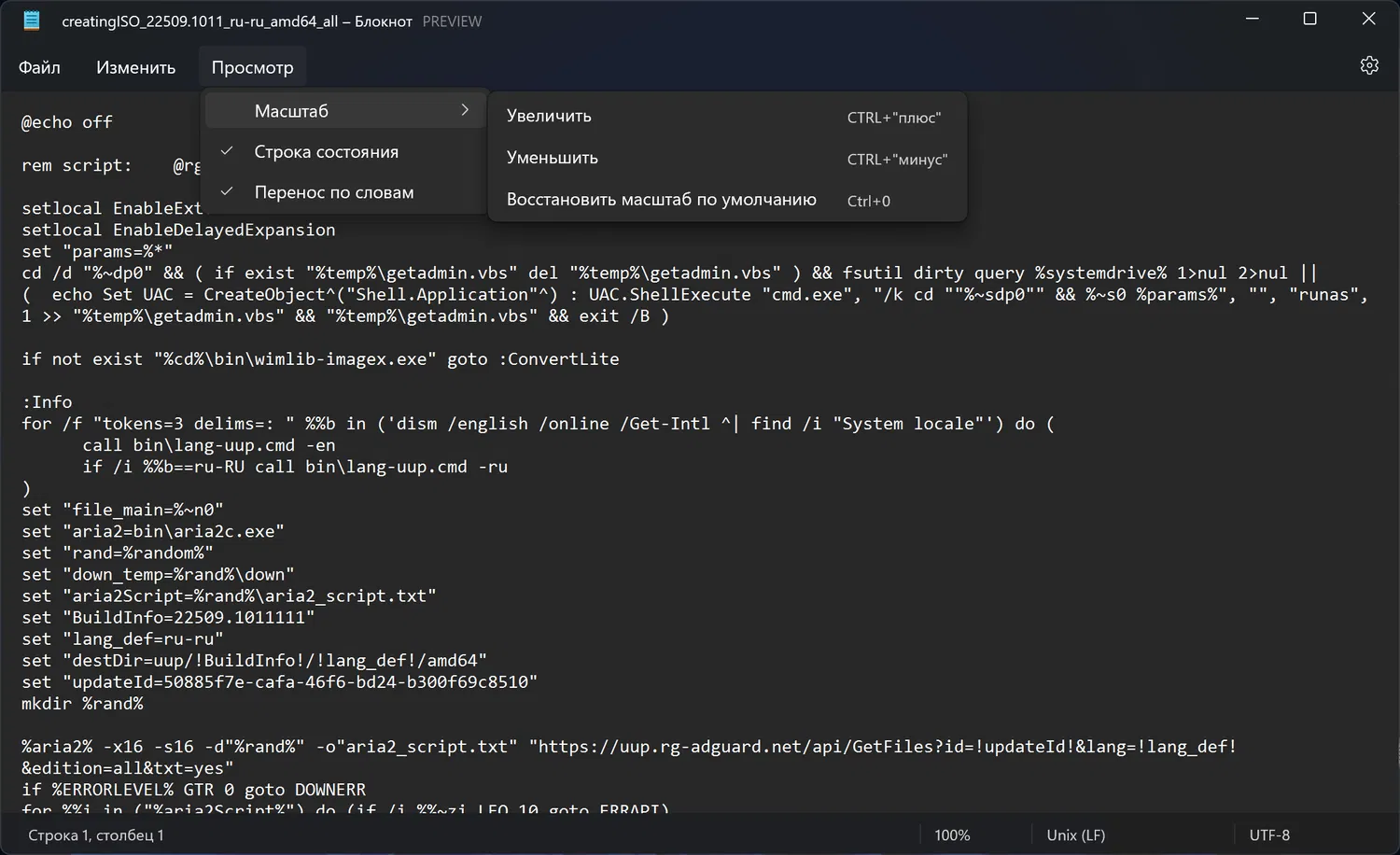 В меню Просмотр собраны параметры для управления масштабированием, включения и отключения строки состояния и переноса слов. Меню Формат было полностью удалено. Аналогичным образом, меню Справка было удалено в пользу раздела Информация о приложении на странице Настройки, которая открывается при выборе иконки шестеренки в правом верхнем углу Блокнота.