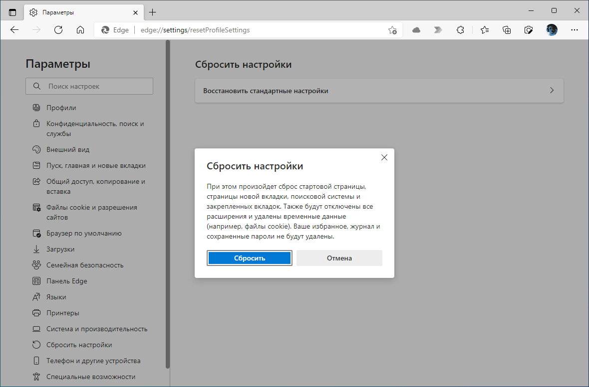 edge://settings/resetProfileSettingsв адресную строку браузера и нажмите Enter. - Выберите опцию Восстановить стандартные настройки.