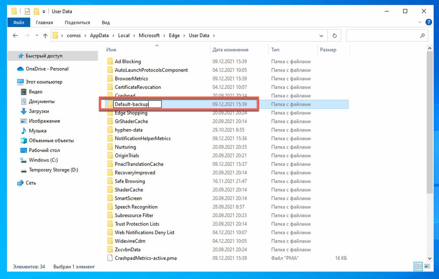 - Переименуйте папку Default, например в Default-Backup. Папка Default — это папка профиля веб-браузера Microsoft Edge. Переименовывая ее, вы удаляете доступ Edge к данным, и в этом случае браузер при следующем запуске создаст новую папку профиля по умолчанию.