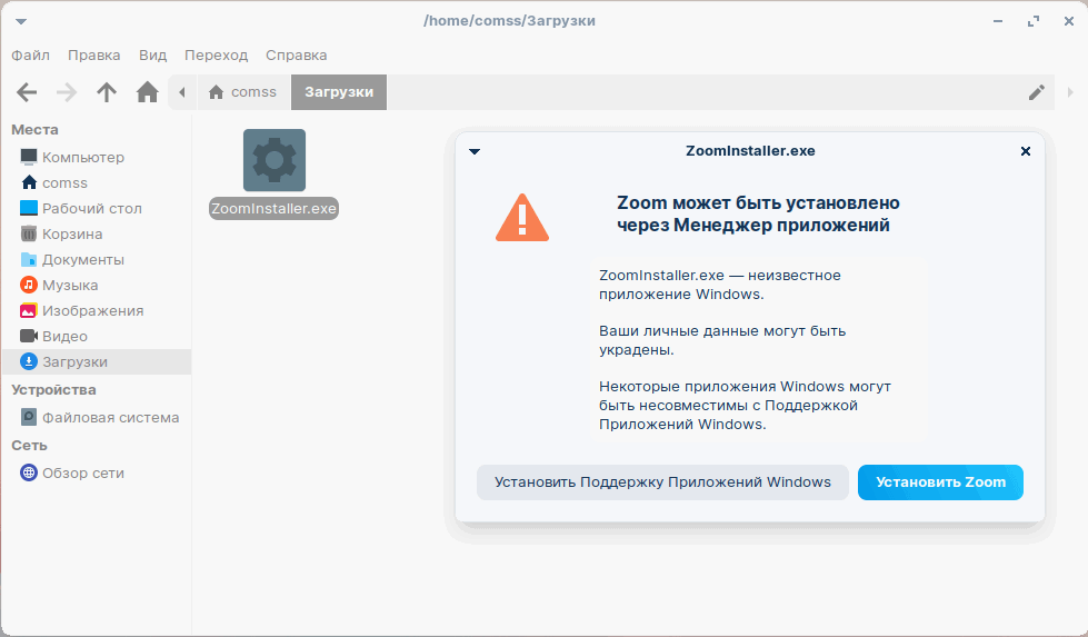 Если система распознает файл .exe или .msi, на который пользователь дважды нажал для запуска, то система автоматически предложит установить приложение или игру (или ее ближайшую альтернативу) из рекомендованного источника, будь то собственный пакет в Центре приложений или оптимизированный скрипт для установщика игры из Lutris или вариант игры из Steam.