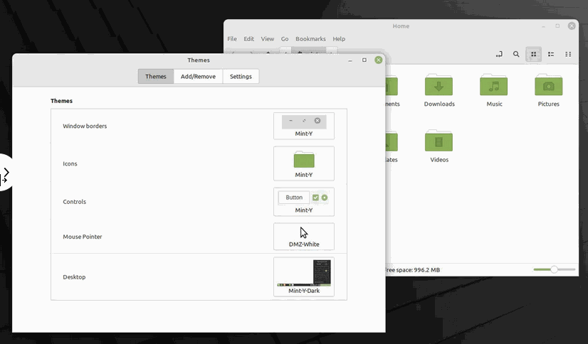 Серьезные изменения коснулись темы оформления. В Linux Mint 20.3 зеленые тона заменены на серые. Изменения дизайна отображения углов окон коснулись и Linux Mint 20.3, теперь в новой версия дистрибутива тема Mint-Y поставляется с закругленными углами окон. Строки заголовков и кнопки управления окнами стали больше.