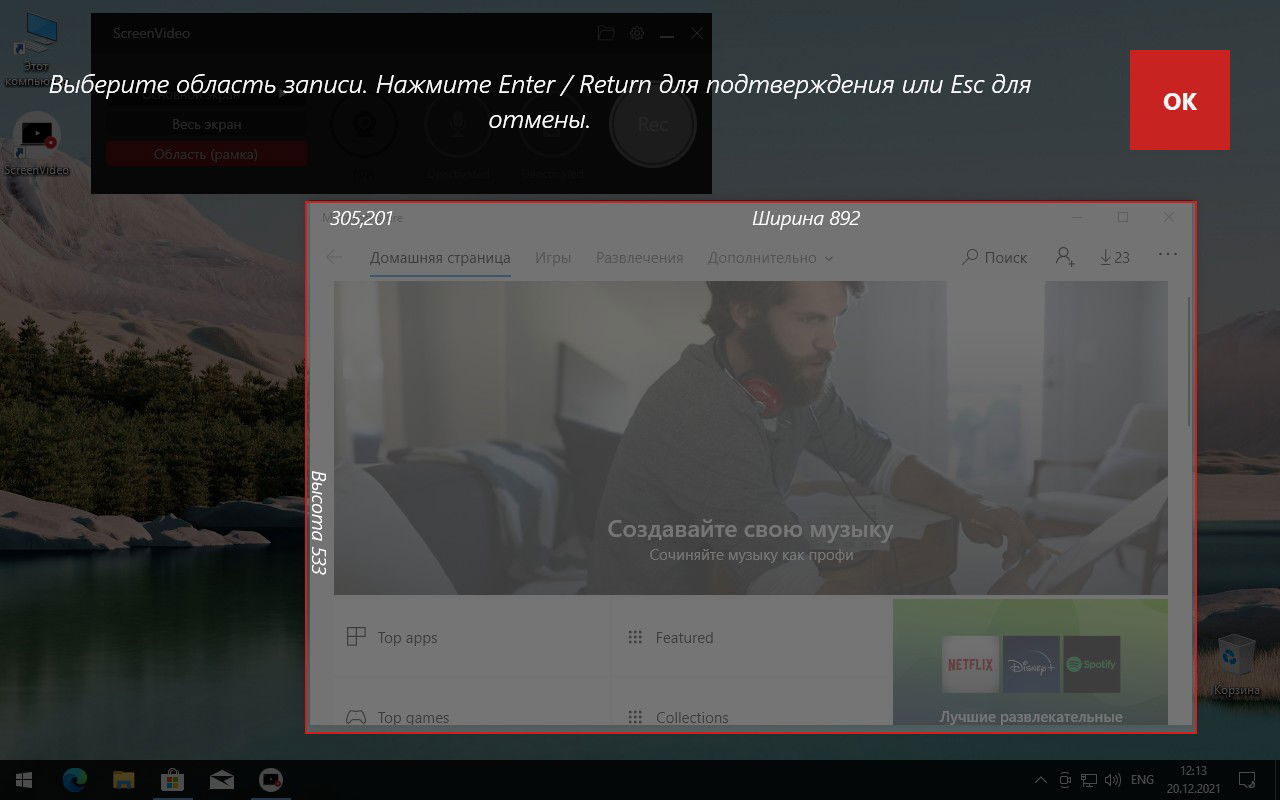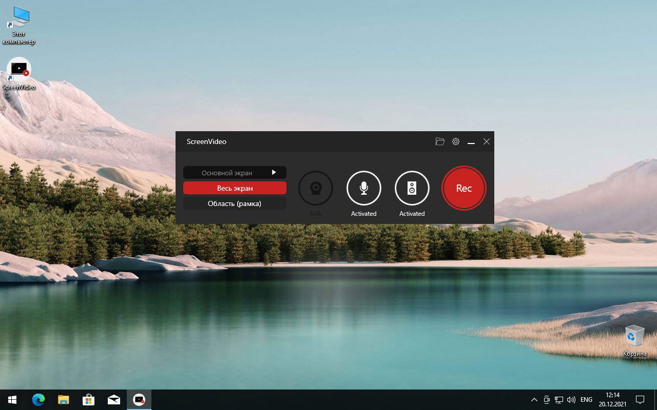 Программа Abelssoft ScreenVideo 2023 имеет простой и понятный интерфейс. В главном окне можно выбрать размер захватываемого видео, а также включить или выключить добавление звука, голоса с микрофона или окна веб-камеры. При выборе захвата участка экрана, вы будете видеть значения высоты и ширины, а также получаемое соотношение сторон, что позволит записывать видео точного размера кадра.